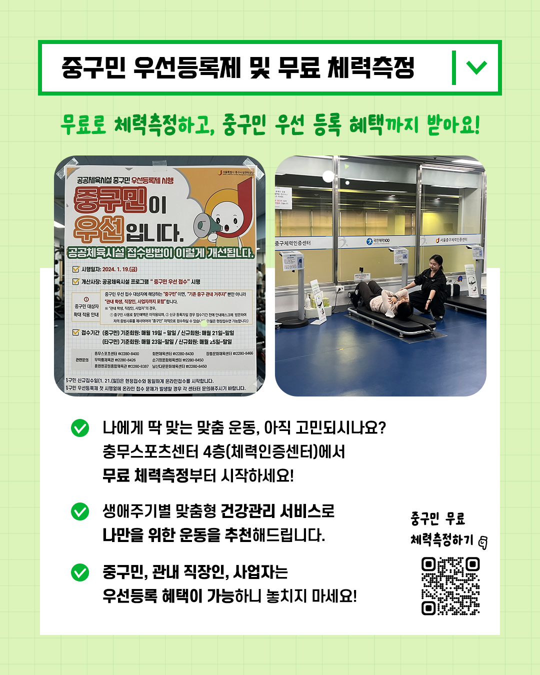 - 중구민 우선입니다 무료 체력측정으로, 공공체육시설 우선 등록