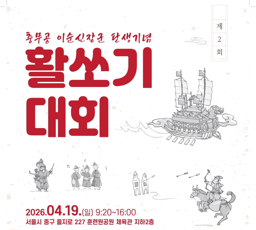 ㅇ 일 시 : 2026. 4. 19.(일) 09:30 ~ 16:30 ㅇ 장 소 : 훈련원공원 종합체육관 (중구 을지로227) ㅇ 주최·주관 : 서울특별시 중구 궁도협회 ㅇ 행사내용 - 종합체육관(지하2층) : 활쏘기 대회 (초등/일반) (09:30 ~ 16:30) - 다 목 적 실(1층) : 팀별 대항전(편사대회) (10:00 ~ 16:00) - 야 외 공 원 : 이순신 캐릭터 활용 인생네컷, OX퀴즈 등 (10:00 ~ 16:00) ※ 궁도를 알릴 모든 방문객을 대상으로 활쏘기 체험존, 포토존, OX퀴즈 등 다양한 부대행사를 열릴 예정입니다. ※ 체험존의 원활한 진행을 위해 사전접수를 아래와 경로로 신청받고 있습니다. (미신청시에도 대기 후 참여 가능) 체험마당 신청 URL -> http://vo.la/PRtidTK ※ 일반부 활쏘기 대회참여 → 대회포스터 내 구글폼 또는 QR신청, 한복우대 ※ 행사문의 → 중구 궁도협회 사무총장 양세희 (포스터 내 연락처 참고) ![]()