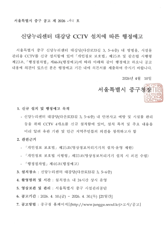 | 신당누리센터 대강당 CCTV 설치에 따른 행정예고 공고 | |||