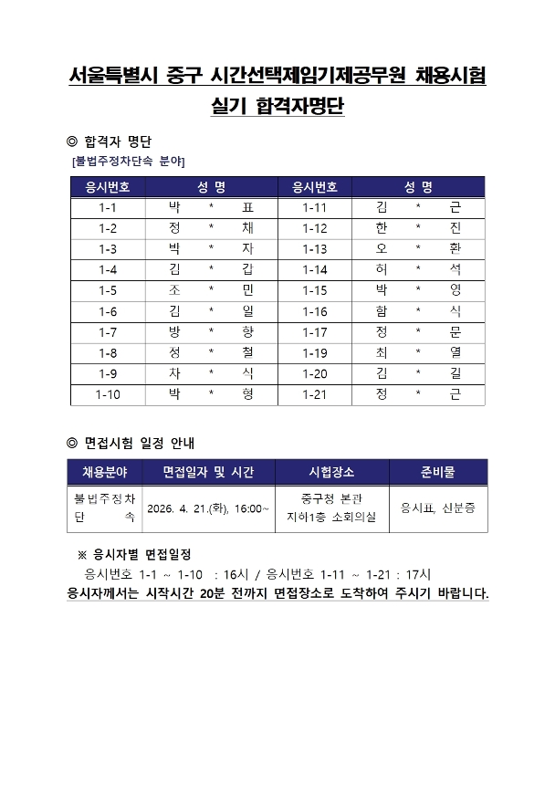 | 일정변경) 서울특별시 중구 시간선택제임기제공무원(주차단속분야) 운전실기 합격자 공개 | |||