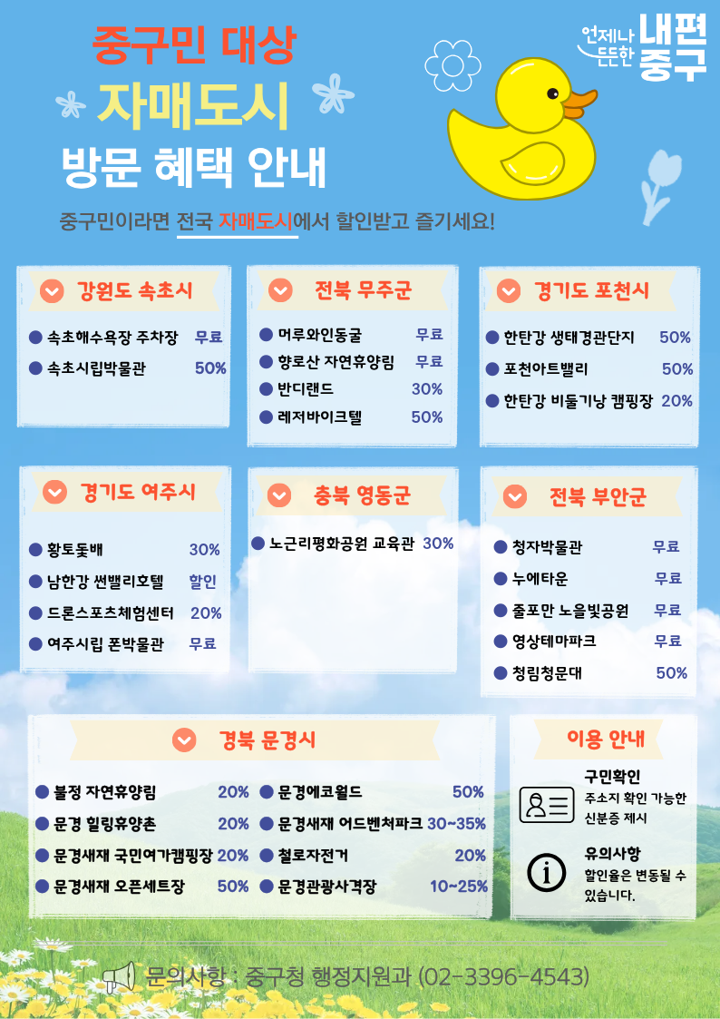 우리 구 자매도시에서 중구민을 대상으로 제공하는 방문 시 할인혜택을 아래와 같이 안내드리니, 서비스 이용에 참고하시기 바랍니다. ![]() ※ 주소지 확인 가능한 신분증 필참 ※ 세부내용 첨부파일 참고 |
