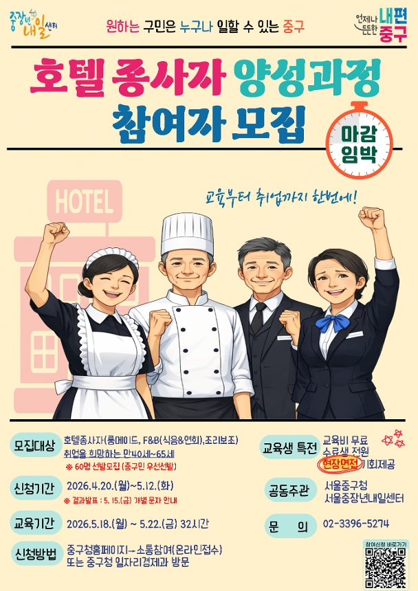 ![]() <2026 호텔종사자 양성과정 참여자 모집> 직무설명회부터 현장면접까지 한방에 지원! ◎ 신청기간 : 2026. 4. 20.(월) ~ 5. 12.(화) ※ 결과발표 : 5.15.(금) 18:00 개별문자안내 ◎ 신청방법 : 중구청 홈페이지 온라인 접수 또는 중구청 일자리경제과 방문 신청 * (온라인) 중구청 홈페이지(http://www.junggu.seoul.kr) →소통참여 → 온라인접수신청 → ‘중구 호텔종사자 양성과정’ 신청 * (방문신청) 중구청 일자리경제과 (창경궁로 17, 중구청 별관3층) 방문 신청 ◎ 제출서류 : 신청서, 개인정보활용동의서 ◎ 교육일정 및 내용 * 교육기간 : 2026. 5. 18.(월) ~ 5. 22.(금) (5일간) * 교육내용 - 1일차 9:00~17:30 → 오리엔테이션, 직무설명회[중구청 대강당] - 2일차 9:00~17:00 → 직무교육(이론)[중구청 대강당] - 3일차 9:00~18:00 → 직무교육(이론)[중구청 대강당] - 4일차 10:00~17:00 → 직무교육(실습) [ 로얄호텔 서울] - 5일차 13:00~17:00 → *수료식* 현장면접[서울중장년내일센터] * 신청링크 https://www.junggu.seoul.kr/booking/content.do?cmsid=16661&order=1&manageSeq=2181 ※ 관련자격증 보유자, 호텔종사 (룸메이드 ,조리보조, F&B(식음료) ) 유경험자 우대 |