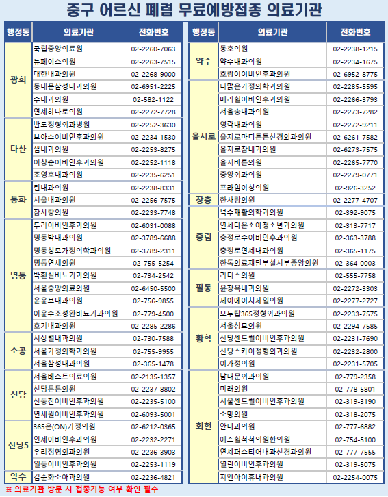 | 중구 어르신 폐렴구균 예방접종 의료기관 현황 | |||
