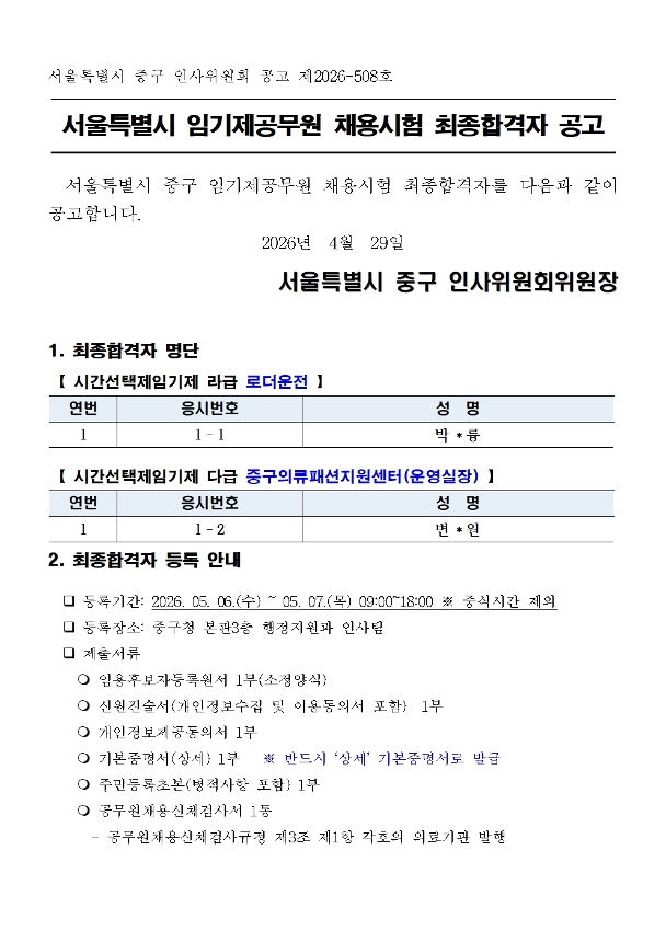 | 서울특별시 중구 임기제공무원 채용시험 최종합격자 공고[로더운전, 중구의류패션지원센터(운영실장)] | |||