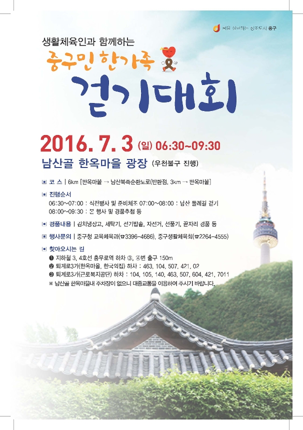 | [중구민 한가족 걷기대회] 2016. 7. 3(일) 06:30~ 남산골 한옥마을에서 개최 | |||