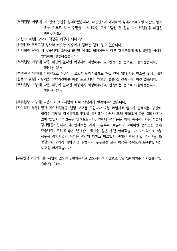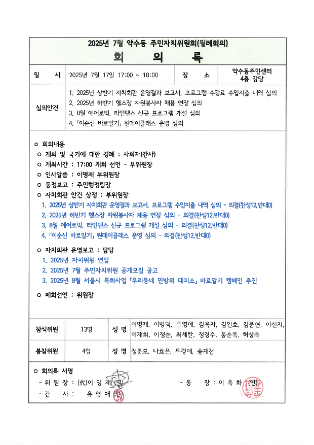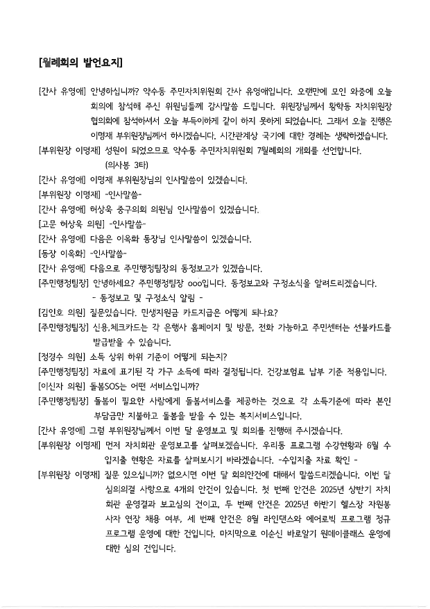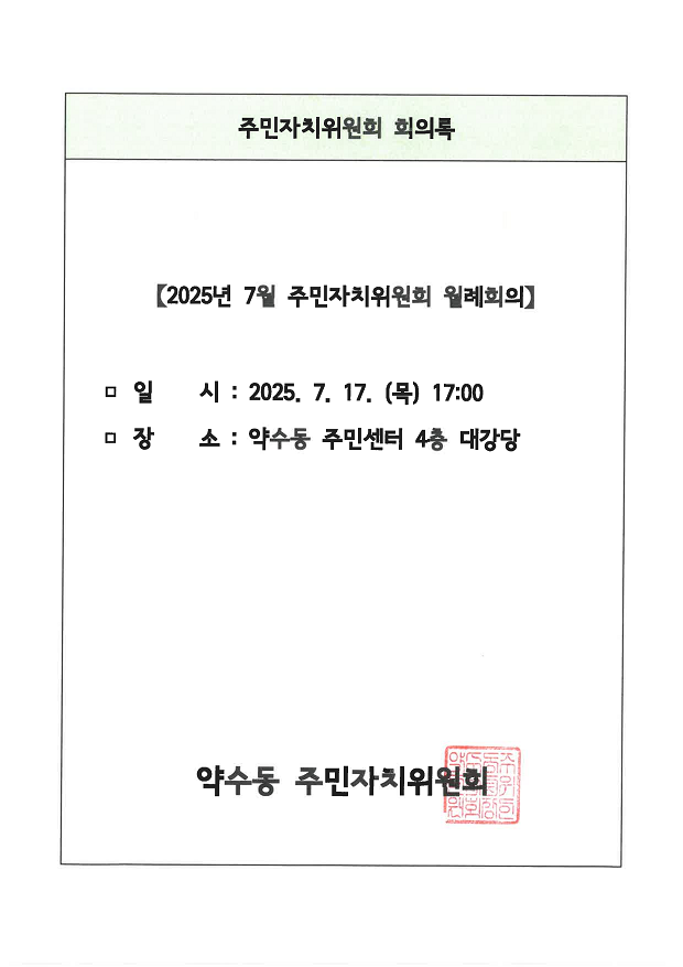 | 회의제목 | 2025년 7월 약수동 주민자치위원회 월례회의 회의록 공개 | ||