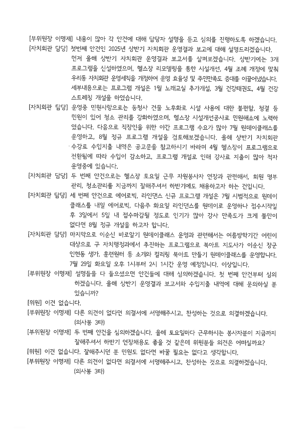 | 안건 | 1. 2025년 상반기 자치회관 운영결과 보고, 수입지출 공고 외 3건 | ||