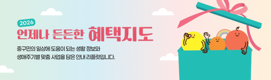 각 리플릿에는 동별 특성에 따른 주요·맞춤형 서비스와 생활시설 정보를 담았으며, 뒷면에서는 전 생애주기별 혜택을 통해 나에게 맞는 중구 서비스를 확인할 수 있습니다. 「2026 언제나 든든한 혜택지도」와 함께 더욱 편리하고 즐거운 중구 생활을 누리시기 바랍니다.