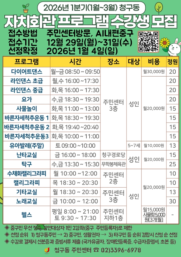 ★2026 청구동 자치회관 프로그램 1분기 수강생 모집안내★