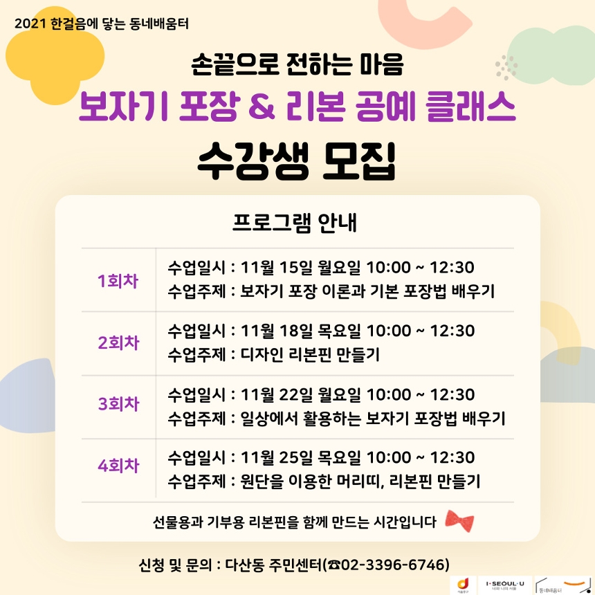 다산동 주민센터에서 '손끝으로 전하는 마음, 보자기 포장 & 리본 공예 클래스'를 개최합니다.