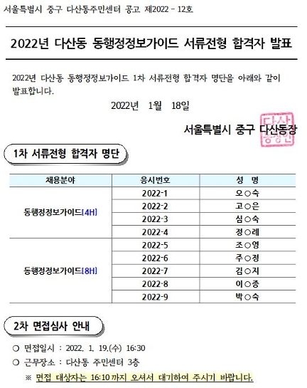 <공고 2022-12호> 2022년 다산동 동행정정보가이드 1차 서류전형 합격자 발표