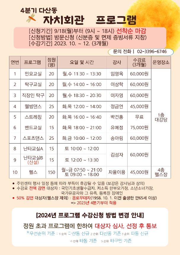 2023년 4분기 다산동 자치회관 프로그램 수강신청 안내