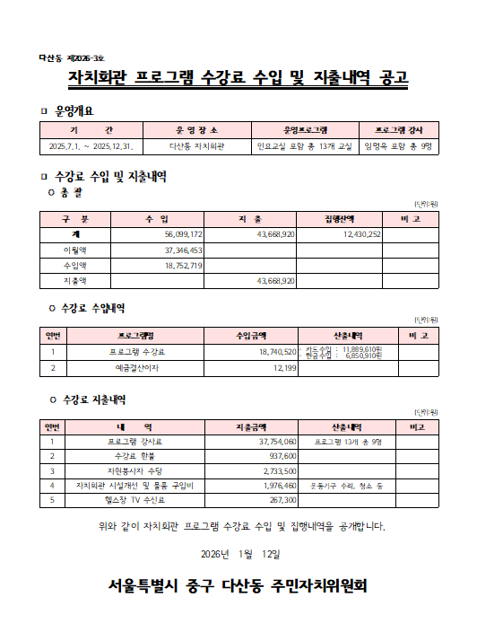 2025년 하반기 자치회관 프로그램 수강료 수입 및 지출내역 공고