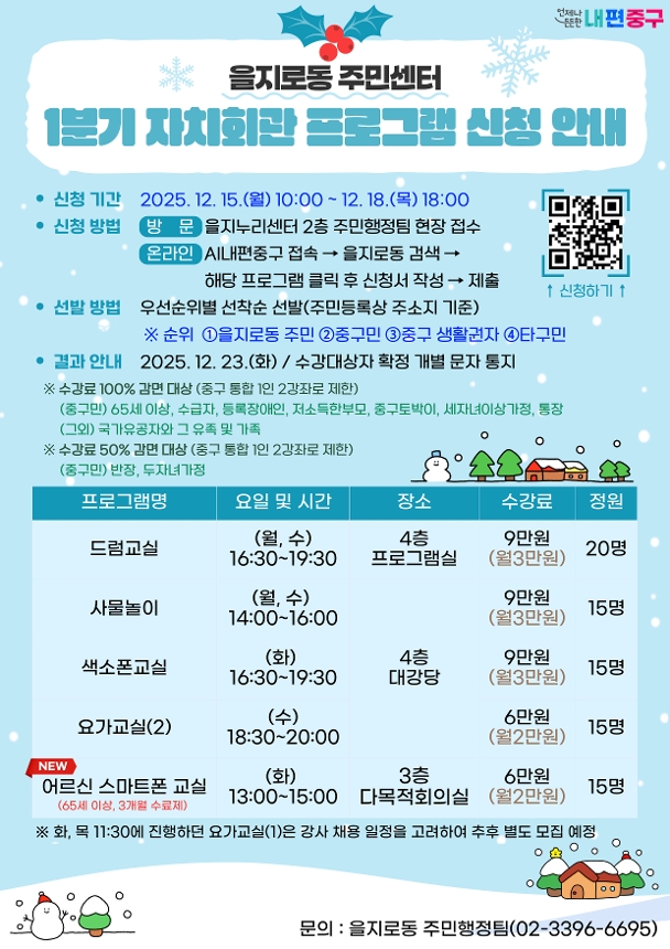 2026년 1분기 을지로동 자치회관 프로그램 수강생 모집 안내