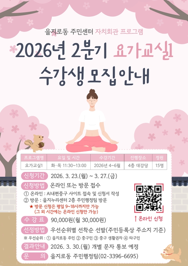 2026년 2분기 자치회관 프로그램(요가교실1) 수강생 모집 안내
