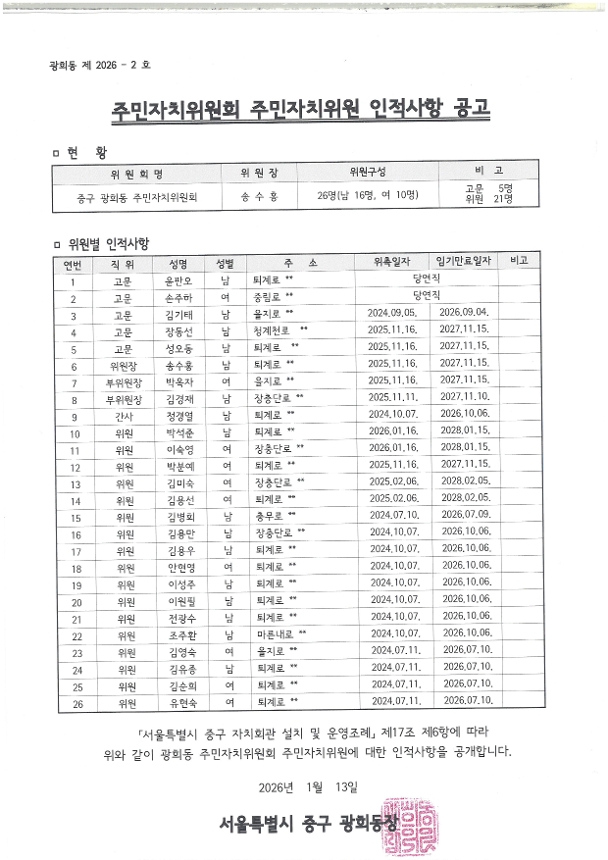 2026년 광희동 주민자치위원회 위원 인적사항 공고