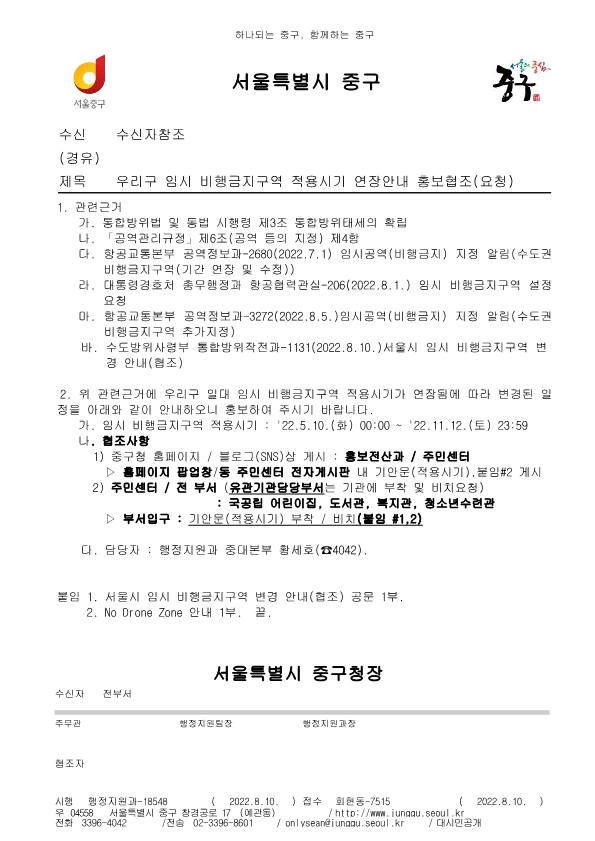 바. 수도방위사령부 통합방위작전과-1131(2022.8.10.)서울시 임시 비행금지구역 변경 안내(협조)