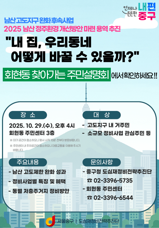남산고도지구완화후석사업으로 2025년 남산 정주환경 개선방안 마련을 위한 주민설명회가 개최되오니 많은 참석 바랍니다.