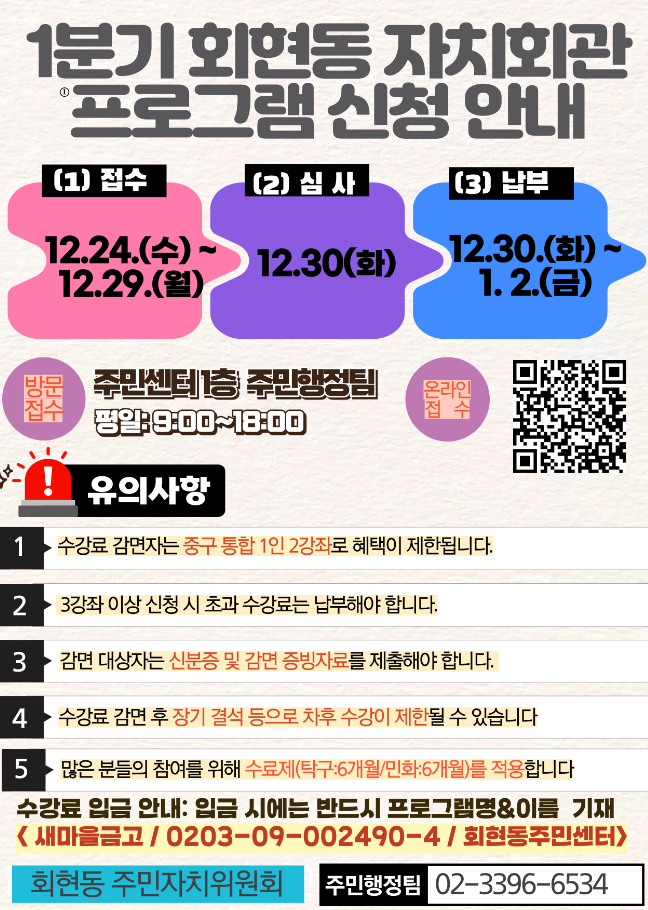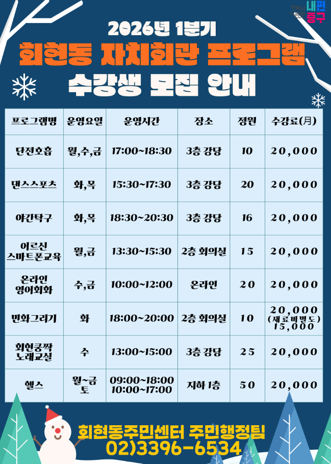2026년 회현동 자치회관 프로그램 신청 안내(12.24.~12.29.)