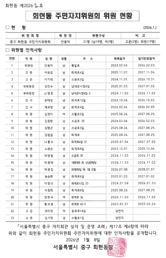 회현동 주민자치위원회 위원 현황(26년 1월 기준)