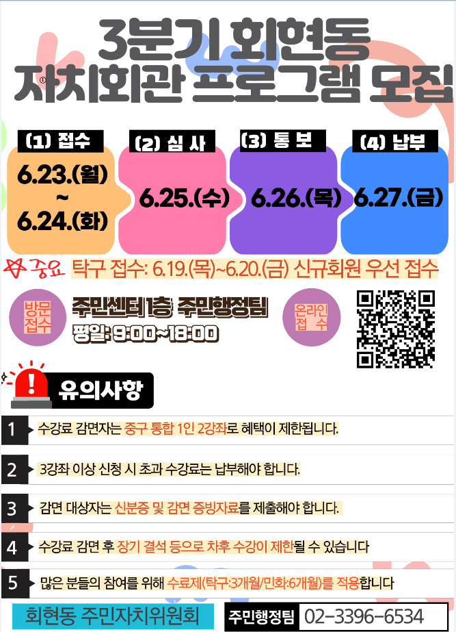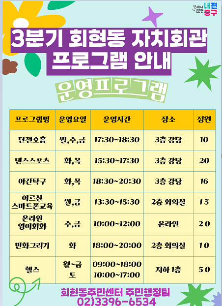 | 이전글 | 2025년 상반기 자치회관 프로그램 수강료 수입지출 내역 공고 |
