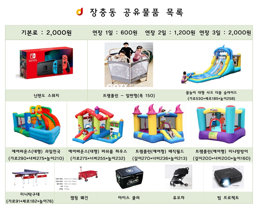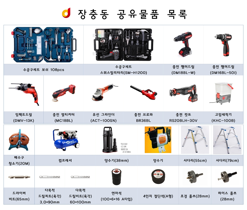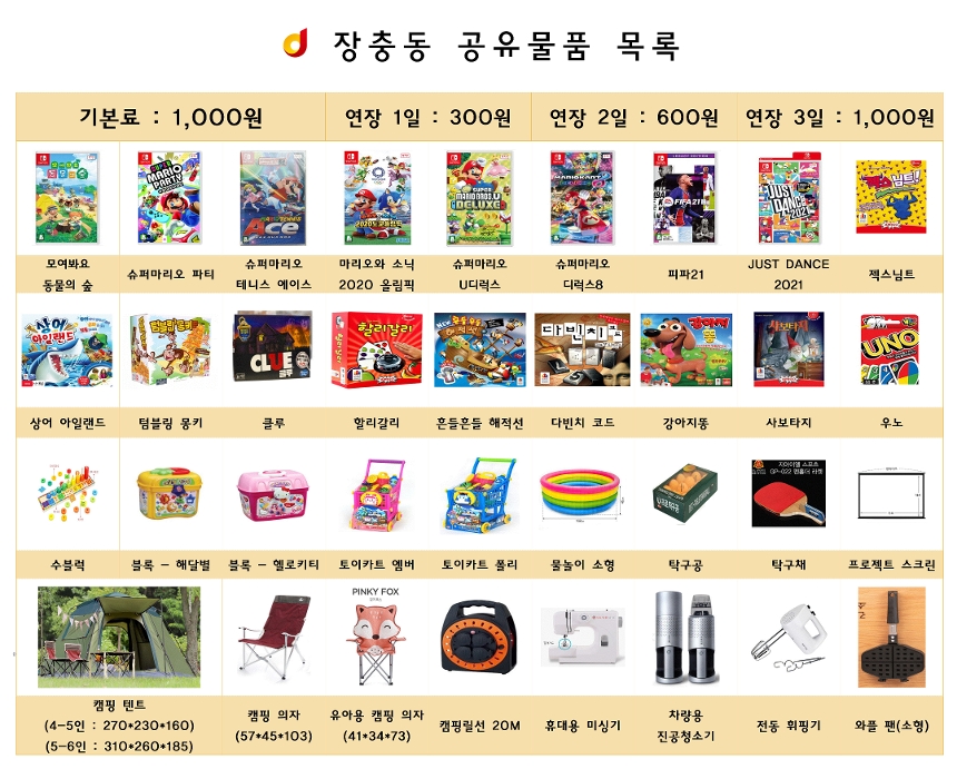 | 공유물품의 원활한 관리를 위하여 21년3월15일부터 공유물품을 유료로 대여하오니 참고하시기 바랍니다. (공구류 무료) |
