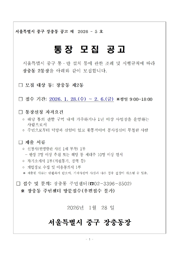 2026년 장충동 주민자치위원회 주민자치위원 인적사항 공고