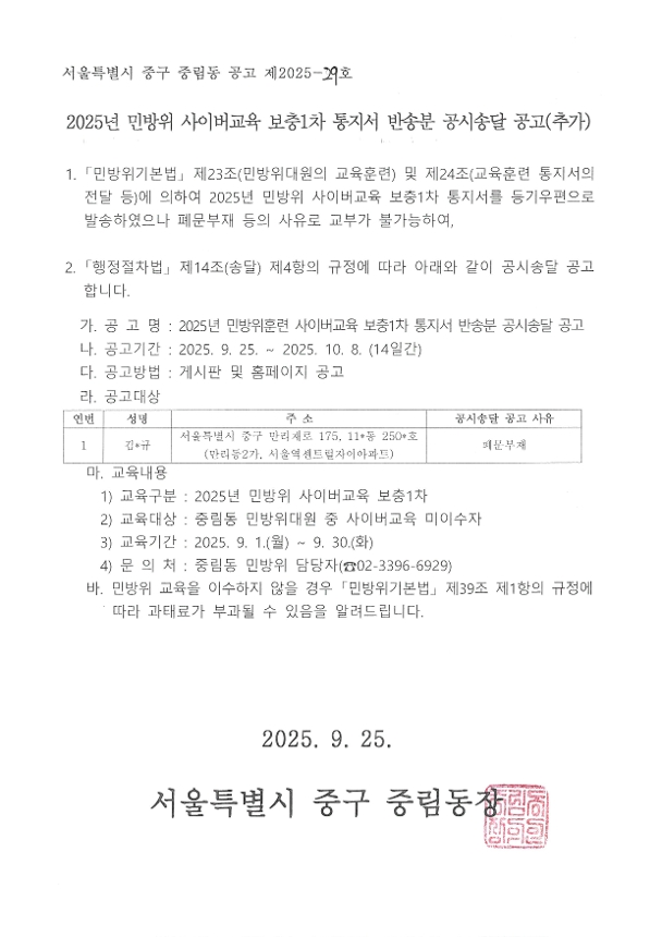 2025년 민방위 사이버교육 보충1차 통지서 반송분 공시송달 공고