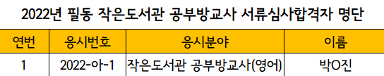 필동 작은도서관 공부방교사 채용 서류전형 합격자 발표