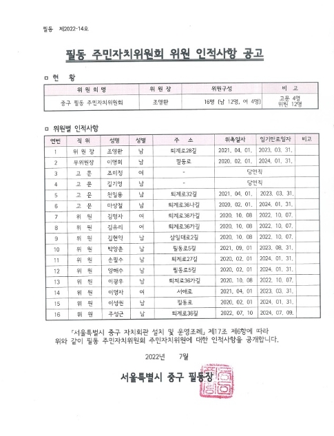 2022년 상반기 필동주민자치위원회 위원 인적사항 공고