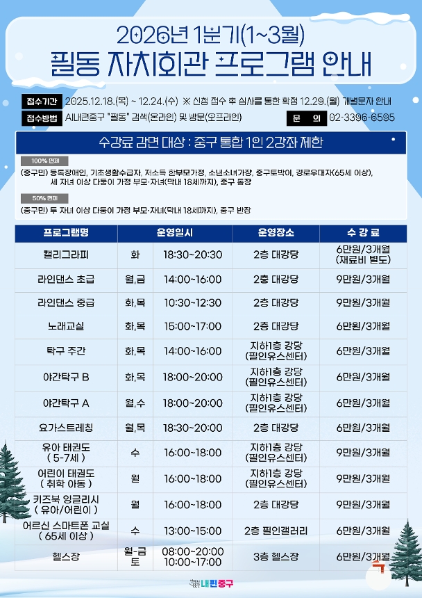 2026년 1분기(1~3월) 자치회관 프로그램 접수 안내
