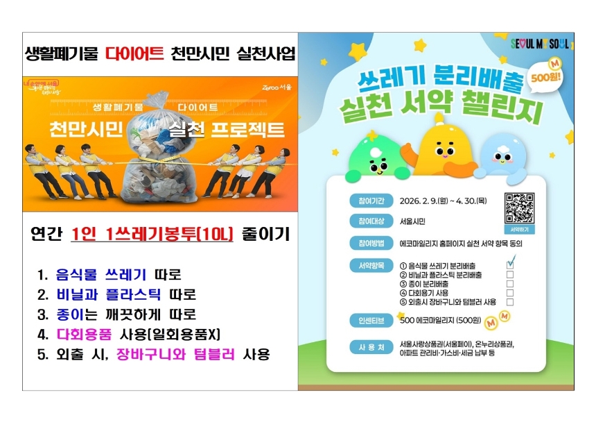 서울시 생활폐기물이 2026년 1월 1일자부터 인천 수도권매립지 직매립이 금지되었습니다. 이에 생활폐기물 다이어트 천만시민 실천사업 캠페인을 통하여 "연간 1인 1쓰레기봉투(10L) 줄이기"를 실천하고자 하오니 많은 동참 부탁드립니다.