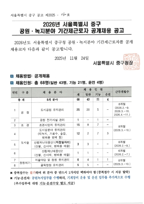 우리구 공원녹지의 효율적인 관리를 위해 「2026년 공원녹지분야 기간제근로자 공개채용」을 아래와 같이 공고 중이오니,