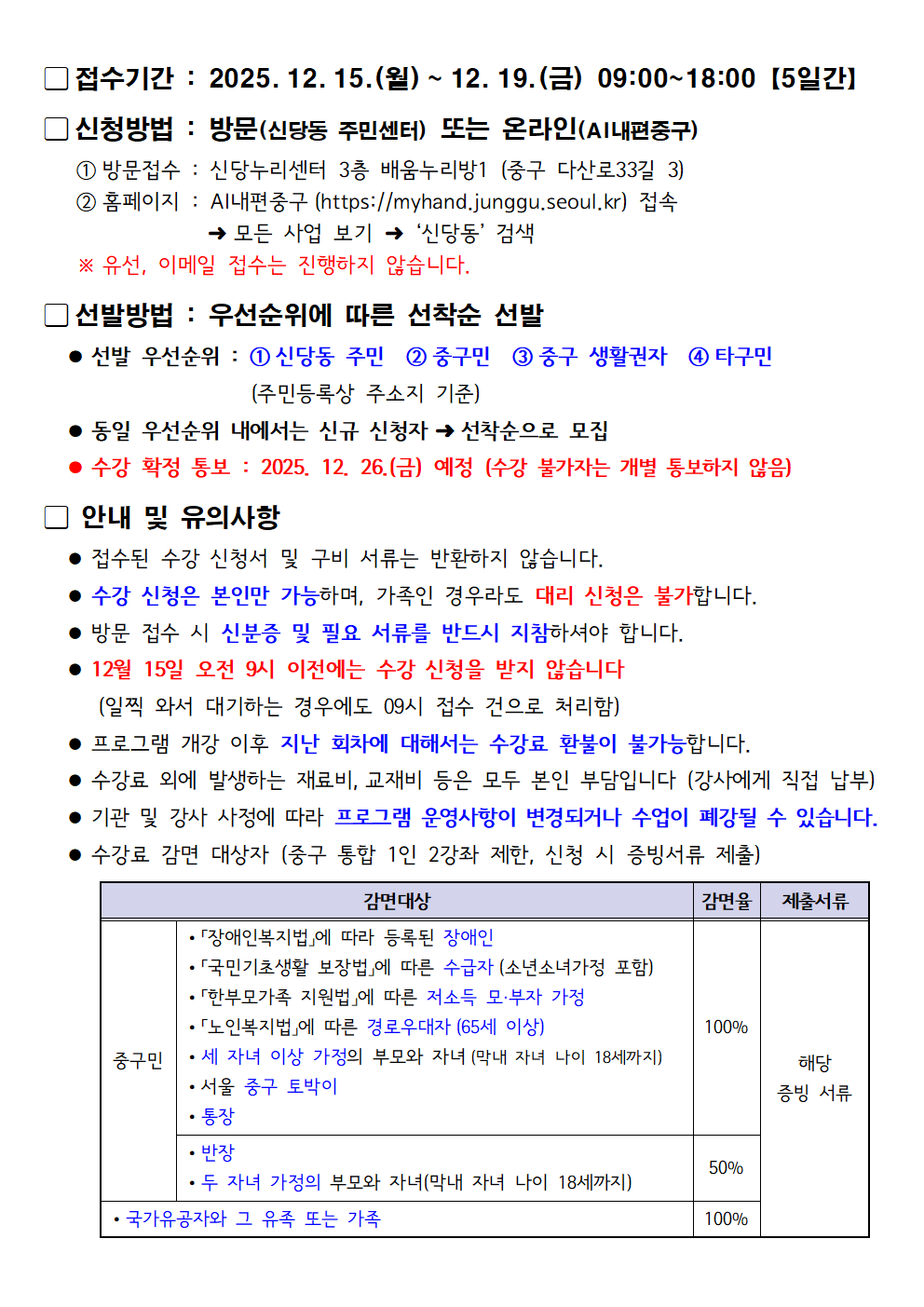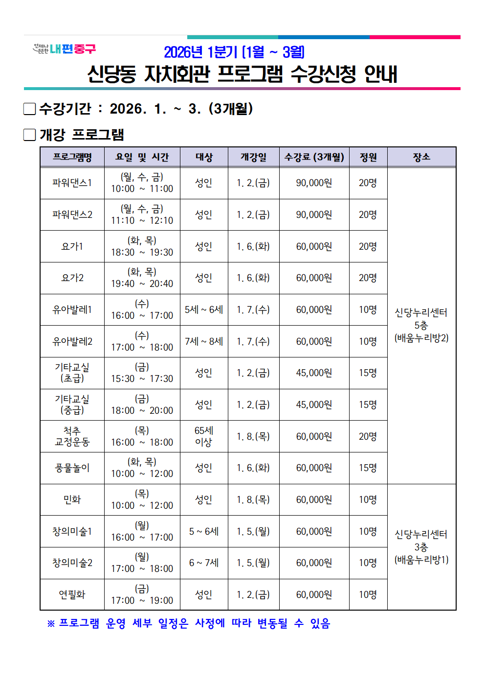 2026년 1분기 자치회관 프로그램 수강생 모집 안내(12. 15. ~ 19.)