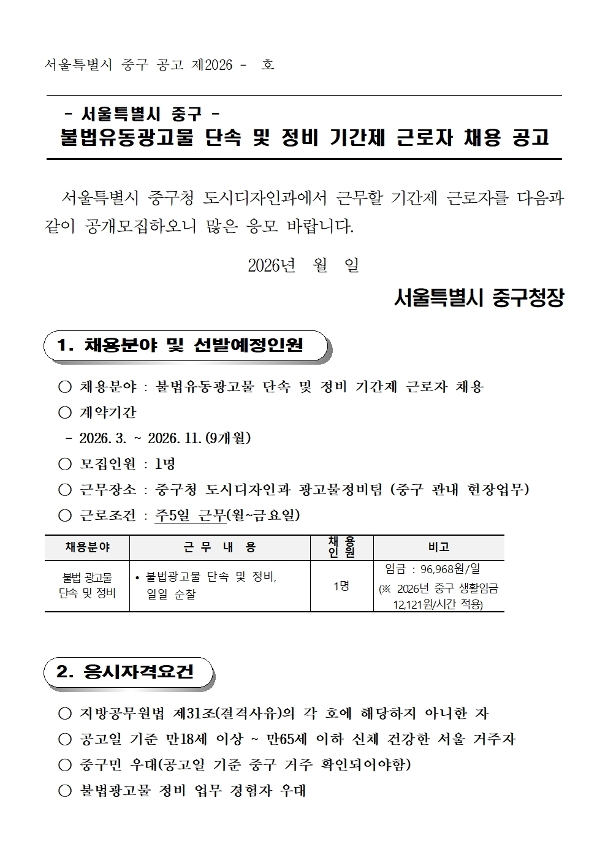 불법유동광고물 단속 및 정비 기간제 근로자 채용 공고