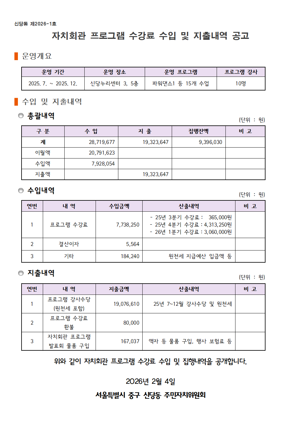 2025년 하반기 자치회관 프로그램 수강료 수입 및 지출내역 공고