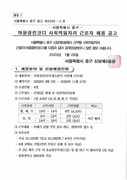 <공고-2020 제4호> 마을클린코디 사회적 일자리 근로자 채용 공고