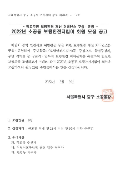 2022년 소공동 보행안전지킴이 회원 모집 공고