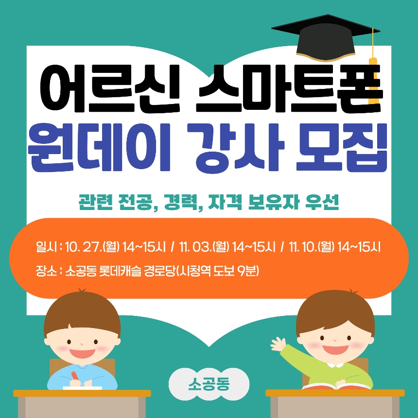 어르신 스마트폰 강사 / 10월 27일, 11월 3일, 11월 10일 월요일 14~15시 / 시청역 도보 9분