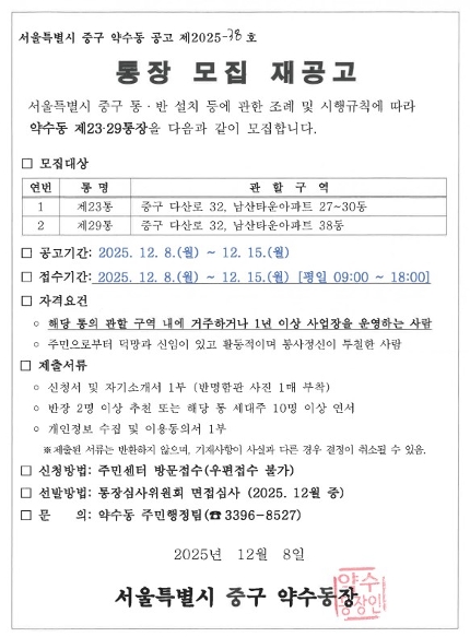 약수통 통장 모집 재공고
