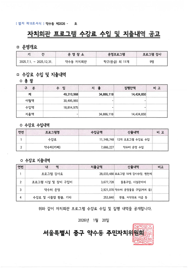 [약수동 공고 제2026-2호] 2025년 하반기 자치회관 프로그램 수강료 수입 및 지출내역 공고