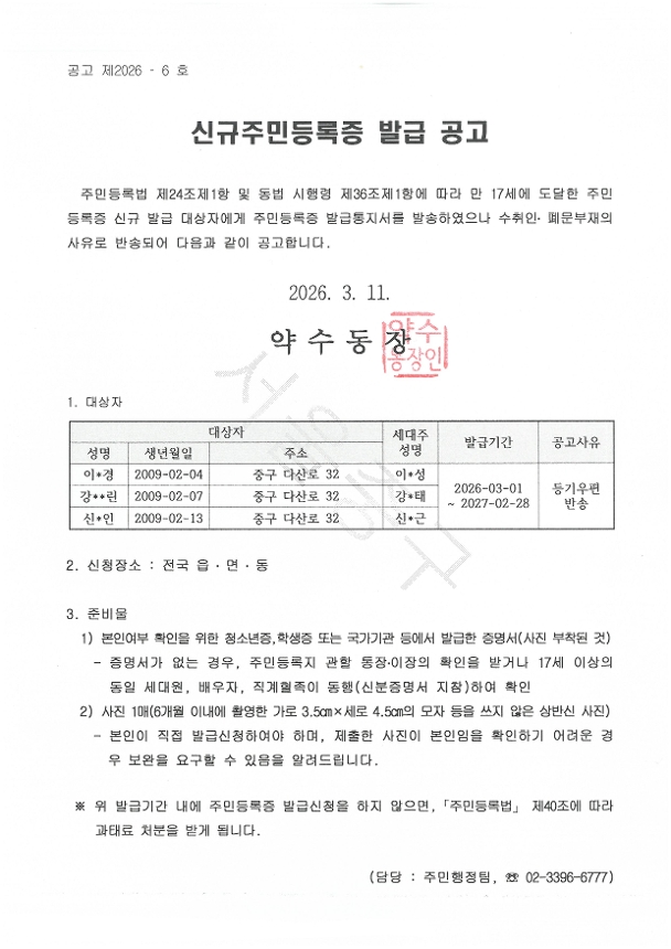 주민등록법 제24조제1항 및 동법 시행령 제36조제1항에 따라 신규 주민등록증 발급통지서를 발송하였으나, 수취인·폐문부재의 사유로 반송되어 송달이 불가능하므로 아래와 같이 공고하고자 합니다.