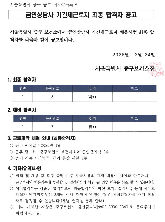 2026년 금연상담사(기간제근로자) 채용 최종합격자 공고