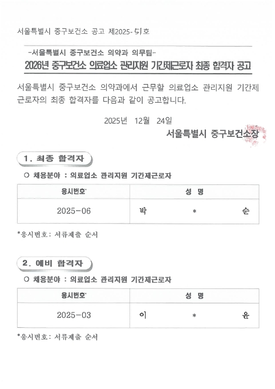 2026년 의료업소 관리지원 기간제근로자 채용 최종 합격자를 아래와 같이 공고합니다.