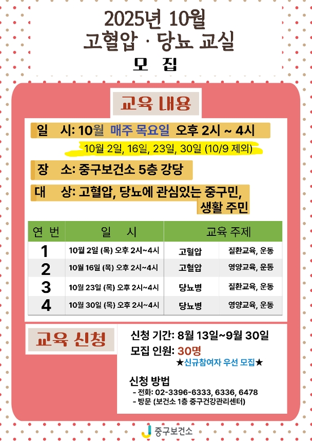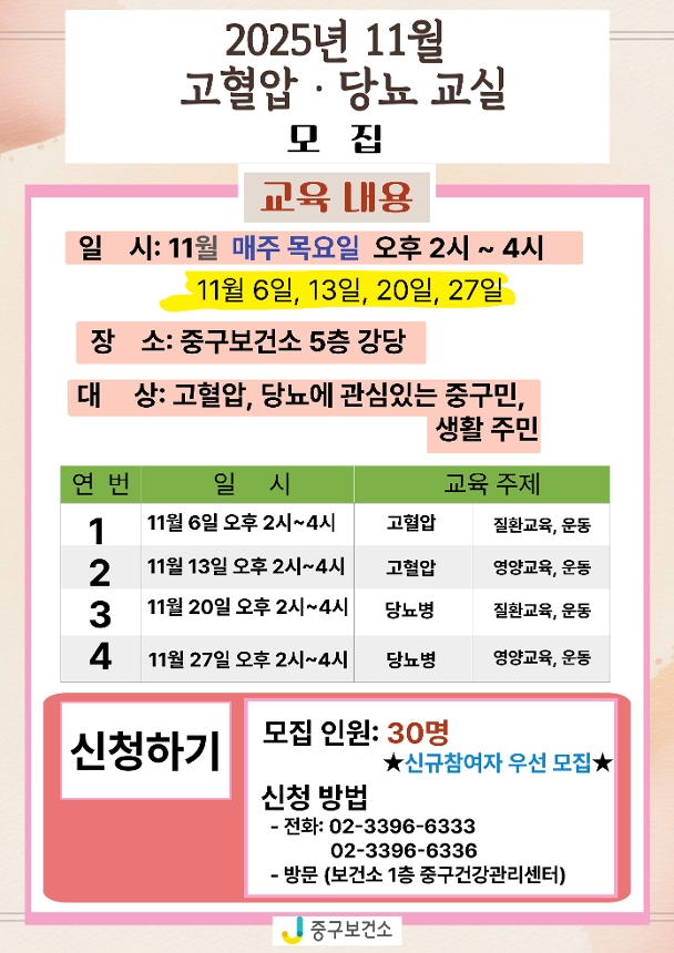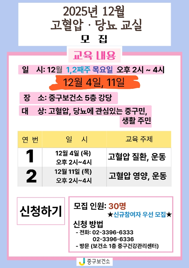 중구보건소 고혈압 당뇨교실 모집 안내