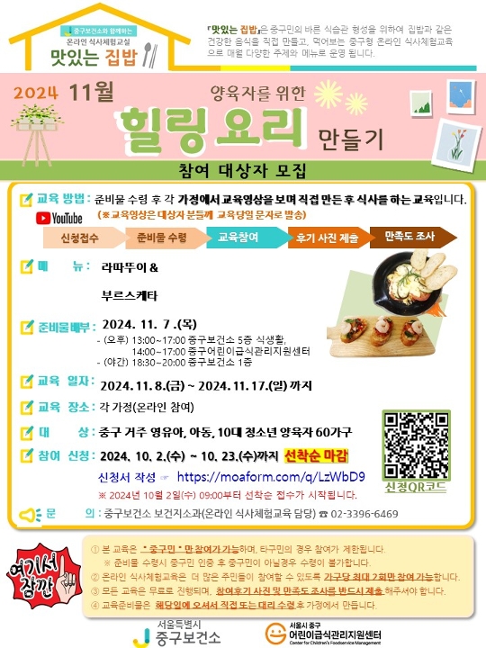 11월은 중구 거주 영유아, 아동, 10대 청소년을 양육하시는 모든 보호자 분들을 응원하고자 [양육자를 위한 힐링요리 만들기]로 진행됩니다.