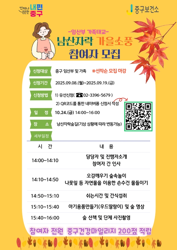 임산부 가족 태교「남산자락숲 가을소풍」 참여자 모집 안내