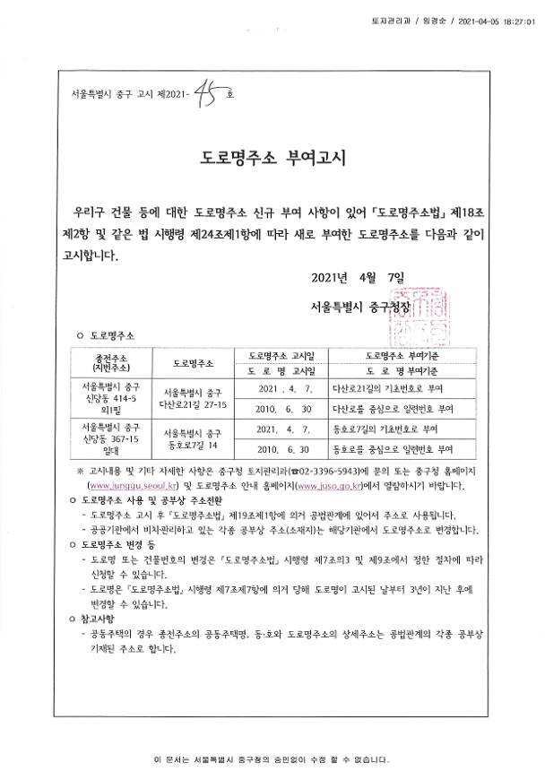 | 분류 | 일반공공행정 > 일반행정 > 주소정책 > 도로명주소 부여 및 폐지 고시 | ||
