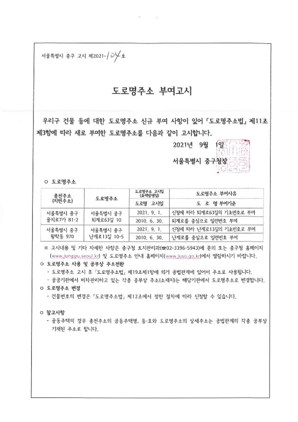| 분류 | 일반공공행정 > 일반행정 > 주소정책 > 도로명주소 부여 및 폐지 고시 | ||