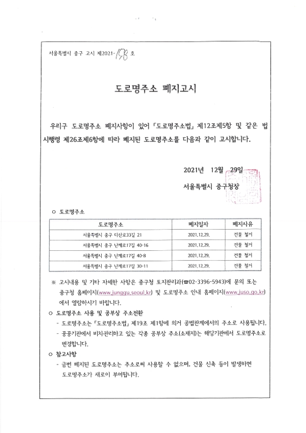 | 분류 | 일반공공행정 > 일반행정 > 주소정책 > 도로명주소 부여 및 폐지 고시 | ||